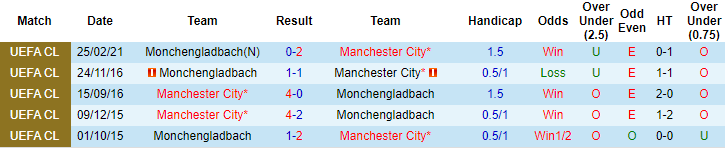 Trước khi gặp nhau mùa này, M'gladbach và Man City đã gặp nhau 4 lần khác tại ở Champions League trong khuôn khổ vòng bảng hai mùa giải 2015/16 và 2016/17. Kết quả: Man City bất bại với 3 chiến thắng và 1 trận hòa, ghi 11 bàn, thủng lưới 4 lần.