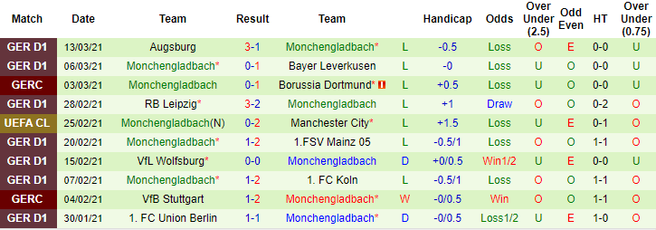 + Thống kê 10 trận gần nhất của M'gladbach