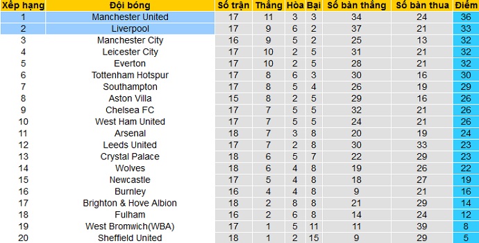Bảng xếp hạng giải ngoại hạng Anh trước vòng 19