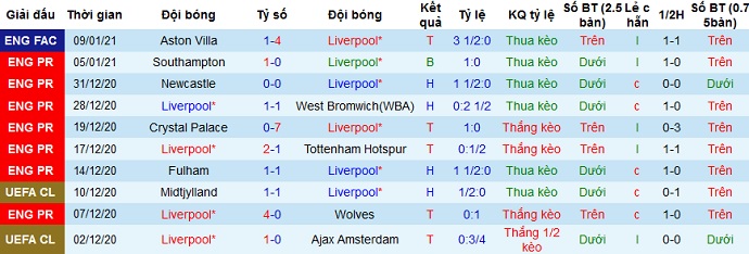 + Thống kê 10 trận gần nhất của Liverpool