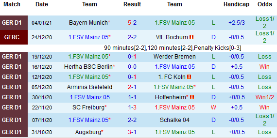 Đáng nói, khả năng tận dụng lợi thế sân nhà của Mainz cũng không đáng nhận được sự tin tưởng khi chưa có chiến thắng nào khi tiếp đón các đối thủ. Phong độ của Mainz hiện tại cũng chưa có nhiều khởi sắc với liên tiếp 7 trận gần đây chỉ biết đến hòa và thua.