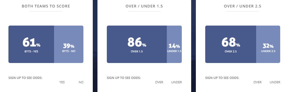 Ngoài ra, cũng xin chia vui với những ai yêu thích lối bóng đá tấn công khi siêu máy tính Ygeteb cũng tin tưởng vào trận này sẽ là một trận cầu mãn nhãn giành cho giới hâm mộ môn thể thao vua. Cụ thể hơn nữa, Ygeteb đã đặt ra độ khả thi của cửa Over 2.5 (Trên 2 bàn thắng) là khá rất cao với 68% độ tin cậy và Over 1.5 (Trên 1 bàn thắng) là gần như tuyệt đối với 86% độ khả thi.