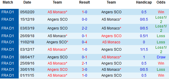 + Lịch sử đối đầu Monaco vs Angers