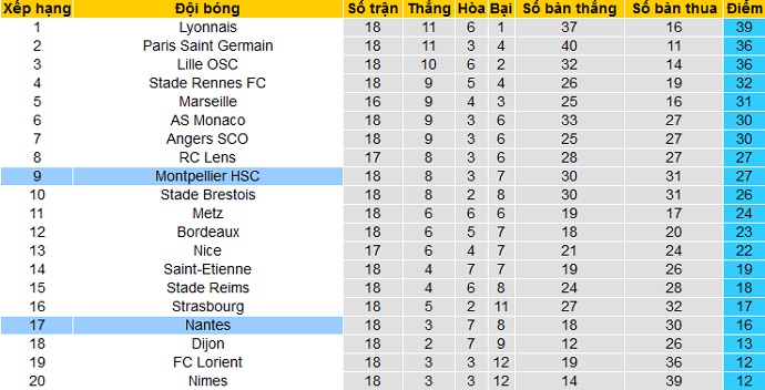 Trong khi đó Nantes mới chỉ có được 16 điểm cũng sau 18 vòng đấu, hiện đang đứng ngay trên nhóm đèn đỏ ở vị trí thứ 17. Hiện Nantes đang có nhiều hơn 2 đội cuối bảng 4 điểm và hơn đội thứ 18 Dijon 3 điểm.
