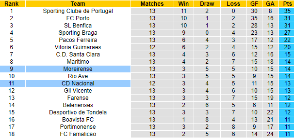 Bên phía chủ nhà, Nacional lại đang cho thấy khả năng tận dụng tốt lợi thế về mặt sân bãi. 20 trận tiếp khách trước đó tính trên mọi đấu trường, Nacional bất bại 18 trận với 11 chiến thắng và 7 trận hòa. Kém Moreirense 1 điểm nhưng đá ít hơn 1 trận, Nacional càng có thêm động lực để giành chiến thắng và vượt mặt đội khách trên bảng xếp hạng.