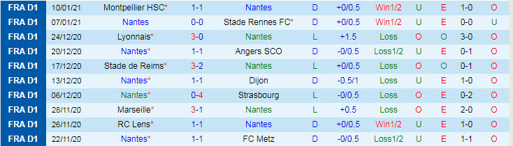 Kể từ chiến thắng trên sân của Lorient vào ngày 8/11 năm ngoái, Nantes đã trải qua chuỗi 10 trận không biết mùi thắng lợi tại giải VĐQG Pháp. Cụ thể, họ hòa 6 và nhận 4 thất bại.