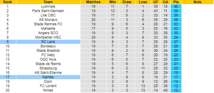 Lúc này, “Chim hoàng yến” đã tụt xuống vị trí thứ 17 trên BXH khi chỉ có được 17 điểm sau 19 trận và chỉ hơn nhóm cầm đèn đỏ đúng 3 điểm. Để nuôi hy vọng trụ hạng, Nantes sẽ phải nổ lực hơn nữa và trước mắt sẽ là mục tiêu giành điểm ở trận tiếp đón Lens diễn ra đêm nay.