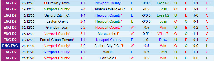 Cũng cần lưu ý, Newport County đang có dấu hiệu sa sút về phong độ với chuỗi 4 trận liên tiếp không biết mùi thắng lợi. Với những dữ liệu kể trên, không bất ngờ nếu Newport County dừng bước tại cúp FA Anh.