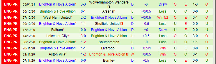 Brighton không có được phong độ tốt nhất khi trải quả mạch 8 trận liên tiếp không biết mùi thắng lợi tại Ngoại hạng Anh. Cụ thể, họ có được 5 trận hoà và nhận 3 thất bại.