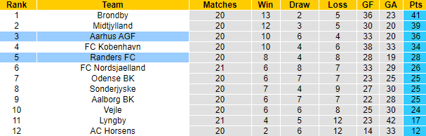 Aarhus đang xếp trên Randers 2 bậc với khoảng cách 8 điểm trên bảng xếp hạng giải VĐQG Đan Mạch. Cụ thể, sau 20 trận, Aarhus giành 36 điểm, xếp ở vị trí thứ 3, trong khi đó Randers giành 28 điểm, xếp thứ 5. Vì vậy ở trận đối đầu sắp tới, Aarhus hoàn toàn xứng đáng được đánh giá cao hơn đối thủ khi được chơi trên sân nhà. Thế nhưng điều đó không có nghĩa Aarhus hứa hẹn vào khả năng giành chiến thắng.