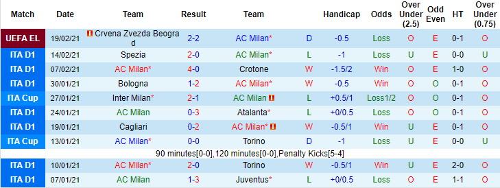 + Thống kê 10 trận gần nhất của AC Milan