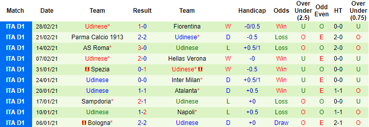 + Thống kê 10 trận gần nhất của Udinese