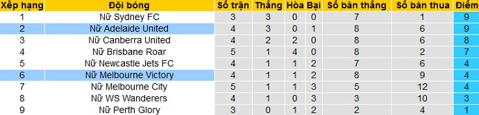 Bảng xếp hạng giải VĐQG nữ Úc vòng 5