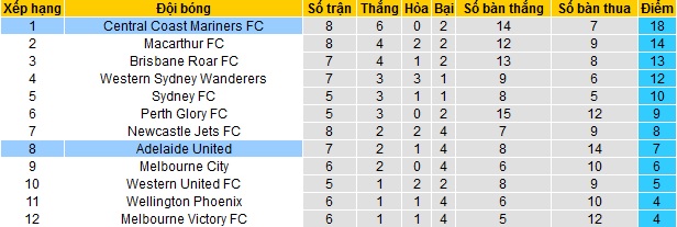 Với thành tích khá tệ trong các trận đấu gần đây, Adelaide United hiện đã tụt xuống thứ 9 trên bảng xếp hạng của giải vô địch quốc gia Úc. Có được 7 điểm sau 7 vòng đấu, đội bóng đang kém các đội trong Top 6 là 2 điểm nhưng cũng chỉ hơn các đội đứng cuối bảng 3 điểm.