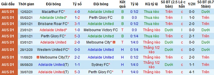 + Thống kê 10 trận gần nhất của Adelaide