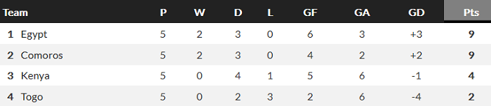 Ở lượt đấu thứ 5 vừa rồi, Ai Cập chỉ thu về 1 điểm từ trận hòa với tỷ số 1-1 với Kenya. ‘May’ cho Mohamed Salah cùng các đồng đội bởi họ vẫn giữ được vị trí đấu bảng trước khi lượt trận cuối cùng khởi tranh. Lý do: Comoros cũng chỉ có được 1 điểm từ trận hòa không bàn thắng với Togo.