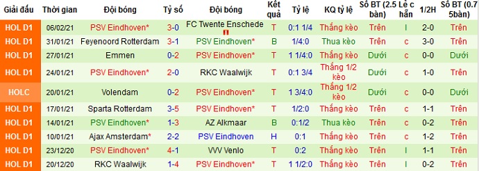Trong khi đó PSV Eindhoven cũng có được thành tích khá tốt với 5 trận thắng và 1 trận thua sau 6 trận gần nhất. Tuy nhiên trên sân khách PSV Eindhoven chỉ có được 3 trận thắng, 1 trận hòa và 1 trận thua ở 5 lần du đấu gần đây.
