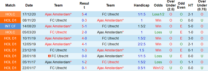 Phong độ và thống kê đối đầu Ajax - Utrecht