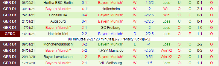 + Thống kê 10 trận gần nhất của Bayern Munich