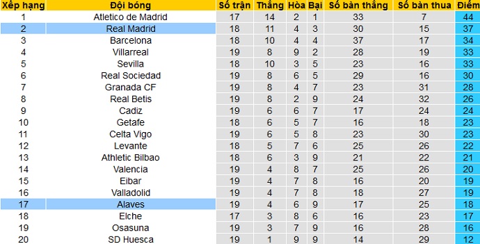 Bảng xếp hạng giải VĐQG Tây Ban Nha vòng 20