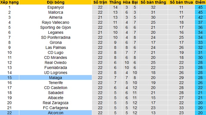 Trong khi đó Málaga chỉ đứng thứ 15 trên bảng xếp hạng nhưng cũng đã có được 28 điểm cũng sau 22 vòng đấu. Hiện tại khoảng cách của Málaga đến các đội Top 6 đang là 6 điểm, còn ít hơn khoảng cách đến các đội cầm đèn đỏ hiện là 7 điểm.