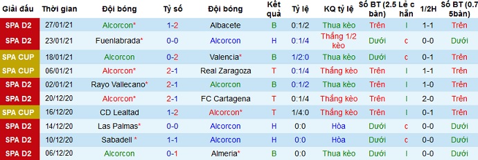 Trong 5 trận đấu gần đây Alcorcón thắng 1, hòa 1 và để thua 3 trong đó có 1 trận thắng và 1 trận thua tại cúp nhà vua. Nếu tính riêng tại giải hạng nhì, Alcorcón đang có 1 trận thắng, 2 trận hòa và 2 trận thua trong 5 vòng đấu gần nhất. Thành tích sân nhà của đội bóng tốt hơn khá nhiều với 3 trận thắng, 2 trận thua sau 5 vòng gần nhất tại đây.