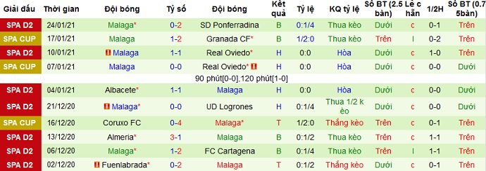 Tuy nhiên ở 5 trận gần đây Málaga cũng chỉ có được 1 trận thắng, 2 trận hòa và 2 trận thua, tính cả các trận tại cúp nhà vua. Nếu tính riêng tại giải hạng nhì, Málaga hòa 3 và để thua 3 trong 6 vòng đấu gần nhất. Thế nhưng thành tích du đấu lại khá tốt với 2 trận thắng, 2 trận hòa và chỉ để thua 1 trận.
