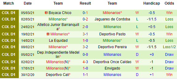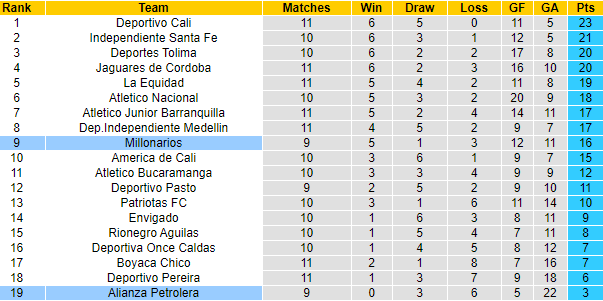 Phía đối diện, Millonarios đang đứng thứ 9 và rộng cửa chen chân vào top 8 – nhóm các đội được dự tứ kết. Cách biệt giữa Millonarios và đối thủ xếp trên chỉ là 1 điểm, mà nên nhớ Millonarios còn đã ít hơn tới 2 trận. Bởi vậy, một chiến thắng trong ngày hôm nay là điều Millonarios hướng đến.