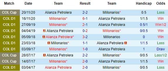 + Lịch sử đối đầu Alianza vs Millonarios