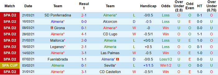 - Thống kê 10 trận gần nhất của Almeria