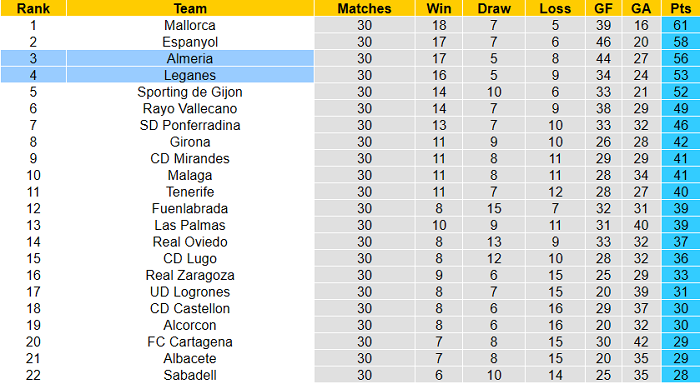 Vì vậy, sân nhà sẽ trở thành điểm tựa để Almeria tiếp đón Leganes - CLB cũng đặt mục tiêu thăng hạng. Leganes có 53 điểm sau 30 vòng và chỉ kém Almeria 3 điểm.
