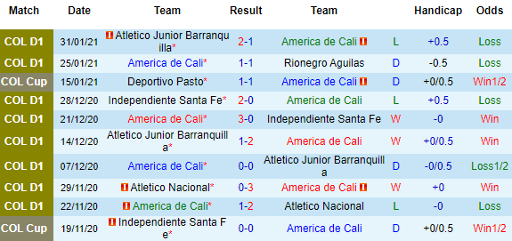 + Thống kê 10 trận gần nhất của America de Cali