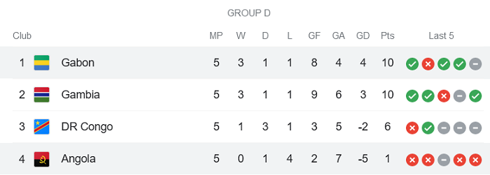 Cục diện bảng D vòng loại CAN Cup 2021 đã ngã ngũ sau lượt đấu thứ 5 vừa rồi. Angola và Gambia chắc chắn trở thành hai đội sở hữu thành tích tốt nhất bảng đấu và đủ điều kiện tham dự vòng chung kết.