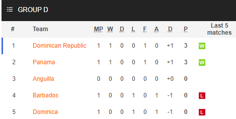 Ở bảng D thì đối thủ chính của CH Dominican là Panama, đội bóng được đánh giá mạnh nhất. Tại lượt đấu mở màn, CH Dominican cũng giành được 3 điểm với chiến thắng tối thiểu như Panama. Trong khi đó thì Anguilla chưa thi đấu trận nào, nhưng ai cũng biết họ quá yếu.