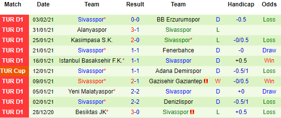 + Thống kê 10 trận gần nhất của Sivasspor