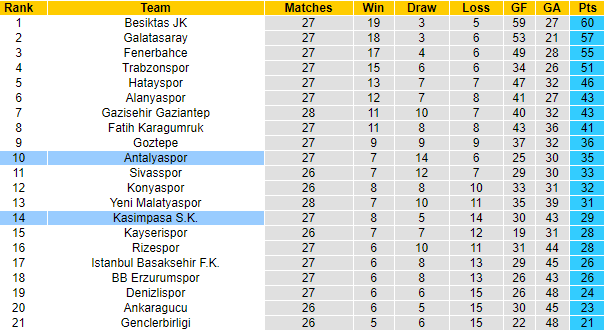 Đấu trường cấp độ cao nhất dành cho CLB của Thổ Nhĩ Kỳ đã đi qua 2/3 chặng đường, cả Antalyaspor và Kasimpasa đều không được giới chuyên môn đánh giá cao và thực tế những gì họ thể hiện từ đầu mùa đã nói lên điều đó. Antalyaspor đang an toàn ở vị trí thứ 10 cùng 35 điểm.