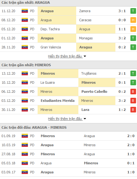 Phong độ và thống kê đối đầu gần đây Aragua vs Mineros Guyana: