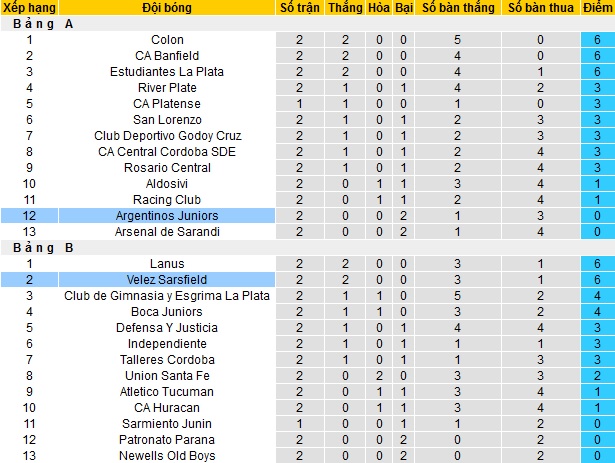 Bảng xếp hạng giải VĐQG Argentina vòng 2