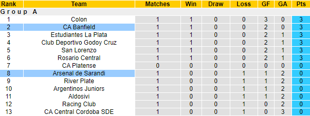 Ở lượt đấu đầu tiên, Arsenal Sarandi thất bại trên sân của San Lorenzo còn Banfield có chiến thắng đầy thuyết phục trên sân nhà trước Racing Club. Khởi đầu của đôi bên như vậy không có gì quá bất ngờ, và nó cho thấy mục tiêu cán đích trong top 4 của Banfield là hoàn toàn có cơ sở.