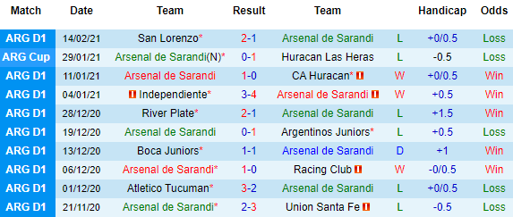 + Thống kê 10 trận gần nhất của Arsenal Sarandi
