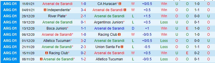 + Thống kê 10 trận gần nhất của Arsenal Sarandi