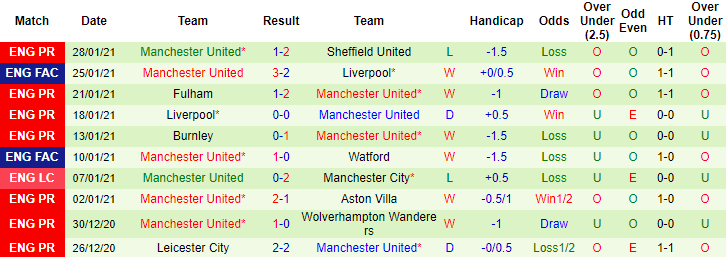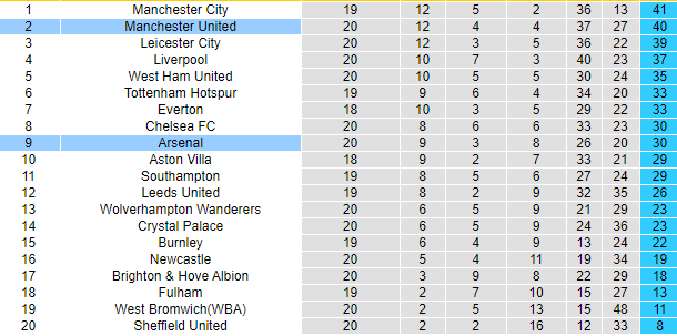 Man United đang có thành tích tốt hơn hẳn so với Arsenal tại giải Ngoại hạng Anh 2020/21. Theo đó, sau 20 trận, Quỷ đỏ giành 40 điểm, xếp thứ 2 trên bảng xếp hạng. Trong khi đó Arsenal với số trận tương tự mới giành được 30 điểm, xếp ở vị trí thứ 9.