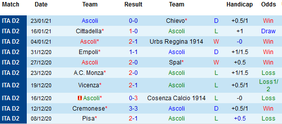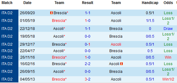 Đều được xếp vào thế cửa trên nhưng Ascoli trải qua liên tiếp 4 trận tiếp đón Brescia gần nhất không thắng và chỉ ghi được duy nhất 1 bàn thắng. Tính ra, trong 9 lần gặp nhau gần nhất giữa 2 đội, có tới 8 lần các vị khách vượt qua kèo châu Á.