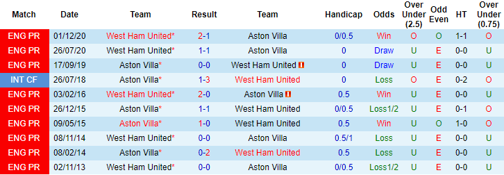 + Lịch sử đối đầu Aston Villa vs West Ham