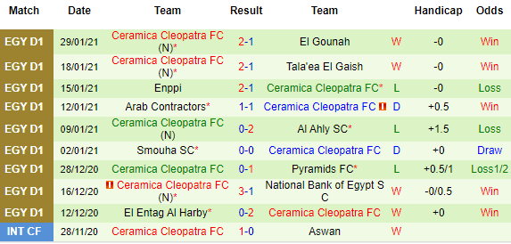 + Soi tỷ lệ kèo châu Á: Tuy chỉ mới thăng hạng nhưng Ceramica Cleopatra chơi rất ổn và tỷ lệ thắng kèo của họ ngang ngửa với Aswan. Ở lần đối đầu duy nhất là trận giao hữu hồi cuối tháng 11/2020, Ceramica Cleopatra đã giành chiến thắng.