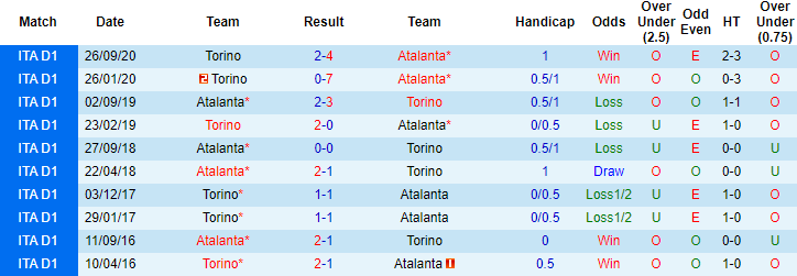 Trận đối đầu giai đoạn lượt đi Serie A mùa này, Atalanta đã thắng tưng bừng 4-2 ngay trên sân của Torino. 2 lần gần nhất chạm trán Torino, Atalanta xé lưới đối thủ tới 11 lần. Thành tích của Atalanta tại giải đấu số 1 Italia mùa này cũng vượt trội so với Torino.