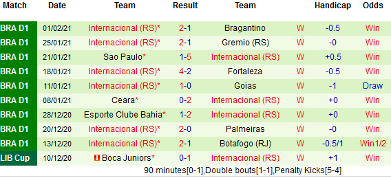 + Soi tỷ lệ kèo châu Á: Trên sàn giao dịch châu Á, Athletico Paranaense là cái tên rủi ro cho giới mộ điệu khi chỉ có 39.39% số trận thắng theo tỷ lệ từ đầu mùa. Thành tích tương tự của Internacional cao nhất giải với 63.64% số trận thắng.