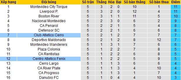 Trong khi đó Club Atlético Cerro lại có phần tiến bộ khá nhiều so với vị trí áp chót ở lượt đi. Hiện tại đội bóng đang đứng thứ 7 trên bảng xếp hạng với 7 điểm sau 5 vòng đấu đầu tiên. Tuy nhiên khoảng cách với đội đầu bảng Liverpool hiện cũng đã lên tới 7 điểm.