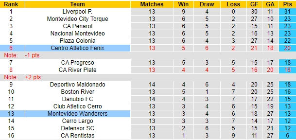 Dù thế thì cả Atletico Fenix lẫn Montevideo Wanderers đều đang có được sự an toàn, và trận cầu này trên thực tế chỉ còn ý nghĩa về mặt danh dự. Atletico Fenix cho thấy phong độ ổn định hơn vào thời điểm này. Họ toàn thắng 4 vòng đấu gần nhất và đã leo lên vị trí thứ 6.