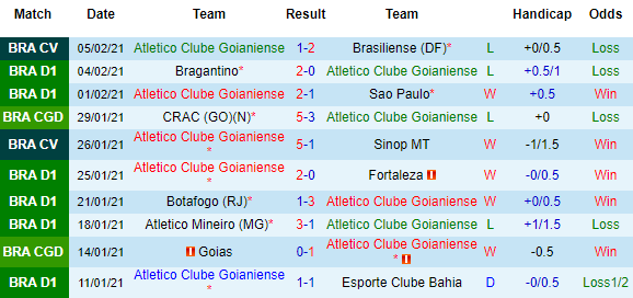 + Thống kê 10 trận gần nhất của Atletico GO